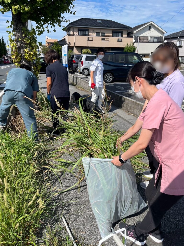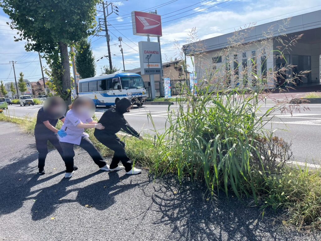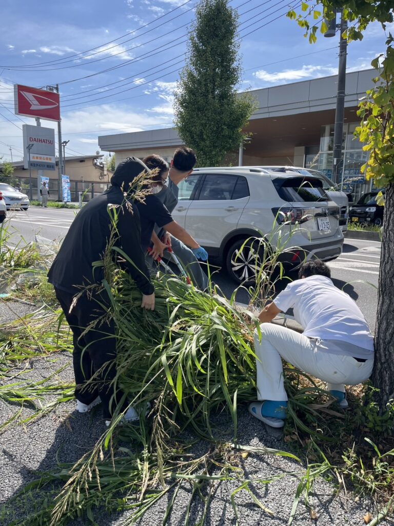 出入り口の雑草の丈が伸びて危ないとの事でみんなで抜いたり