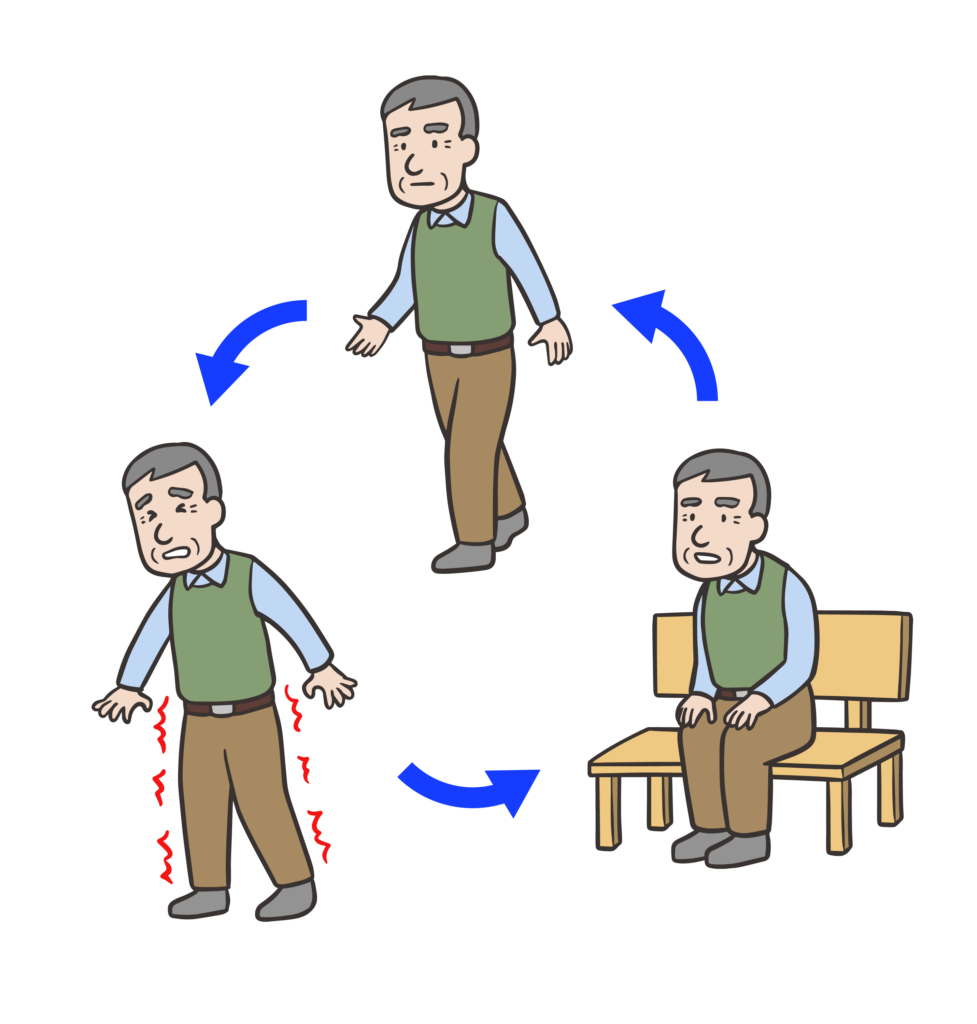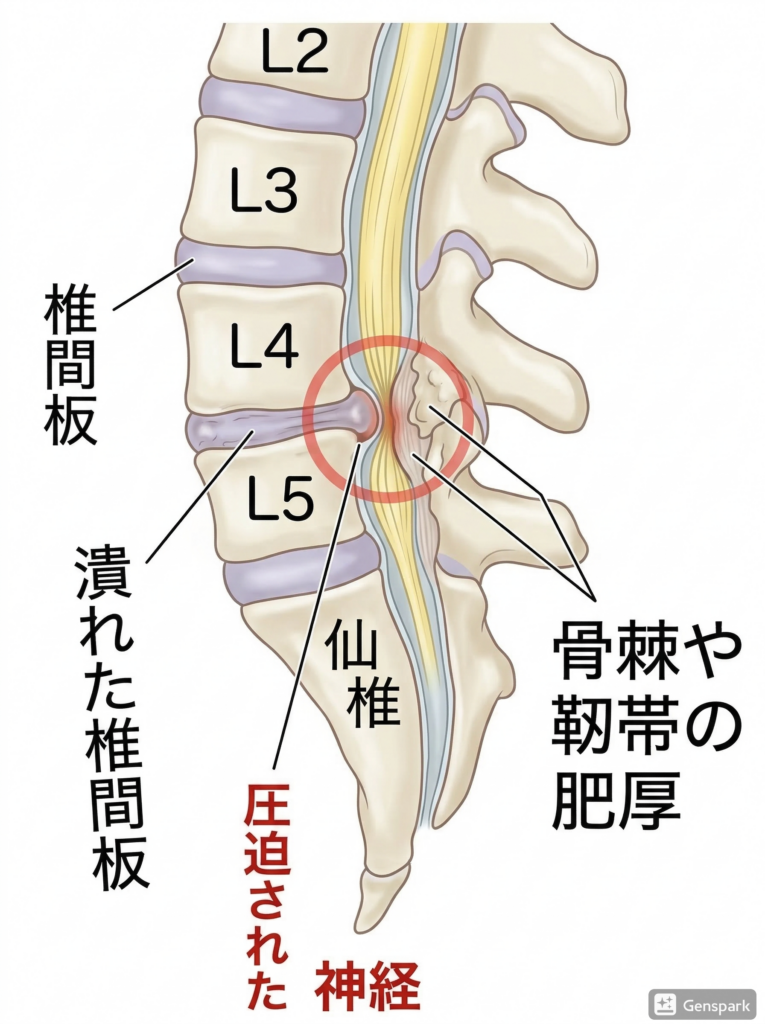 このような症状は、一般的に**「腰部脊柱管狭窄症(ようぶせきちゅうかんきょうさくしょう)」**と呼ばれる疾患の可能性が高いです。